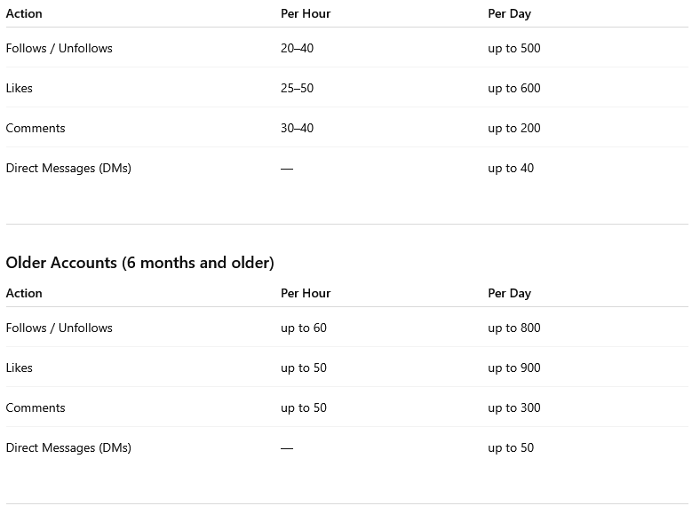 💡 Note: Follows and unfollows are counted together — e.g., 500 per day means total follows + unfollows.⚠️ Note: Follows and unfollows count towards the same daily limit.